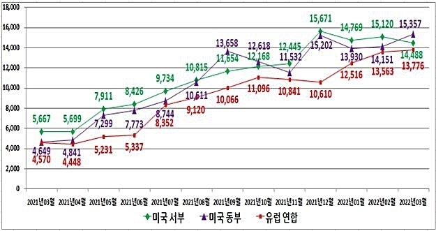 또 미국 동부발은 1535만7000원으로 230%가 넘게 뛰었고 유럽연합행도 1377만6000원으로 201.4%나 상승했다.