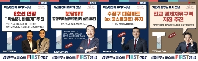 그리고 김민수 예비후보가 SNS를 통해 공유한 세부공약 카드뉴스는 ▲성남-판교 경제자유역 지정 ▲서울공항 이전 및 수정테크노밸리 추진 ▲수정구 대형마트(코스트코 예시) 유치 ▲분당SRT-도심공항터미널 복합센터 건립 추진 ▲지하철 8호선 연장(모란-판교-서현-오포) 등이다. 해당 공약들은 모두 ‘퍼스트 성남’에 속한 공약들이다.