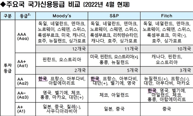 두 번째로 높은 'Aa1'는 핀란드, 오스트리아 2개국에 불과하고, 프랑스, 아부다비, 아랍에미리트가 한국과 같은 3번째 높은 등급 국가다.