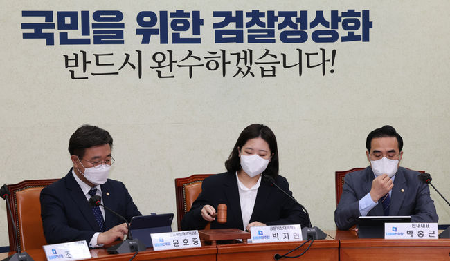 한편 조 대변인은 이준석 국민의힘 대표가 검찰 수사권 완전박탈(검수완박) 입법 여야 합의안 재검토를 지시한 데 대해선 "잠깐 말씀이 있었지만 구체적으로 어떻게 (대응)하자는 부분은 논의하진 않았다"고 신중한 입장을 보였다.