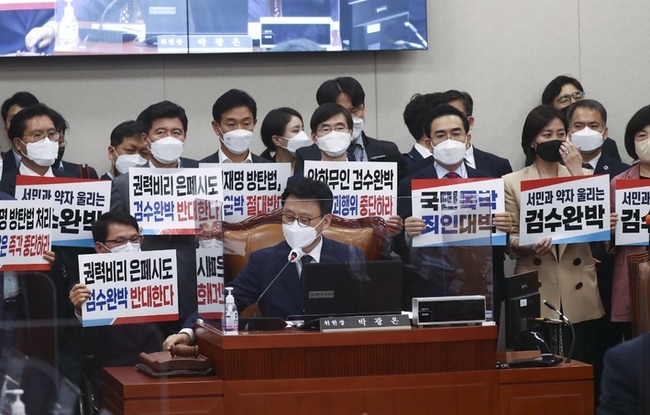 [시사뉴스 홍경의 기자] 더불어민주당이 27일 오전 검찰청법과 형사소송법 개정안 등 '검수완박'법안(검찰 수사권 완전 박탈)을 국회 법제사법위원회 전체회의에서 단독 의결했다.