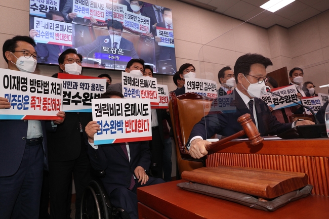[시사뉴스 김철우 기자] 국민의힘은 27일 새벽 이른바 ‘검수완박’ 법안이 더불어민주당 단독으로 국회 법제사법위원회 전체회의를 통과하자 '날치기 통과' ‘원천무효’라며 거세게 반발했다.