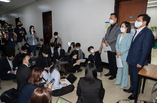 이준석 대표도 법사위 회의실 앞 의총에 참석해 "민주당의 '180석 근육 자랑'"이라며 "가장 위험하고 국민이 바라지 않는 형태의 정치"라고 목소리를 높였다.