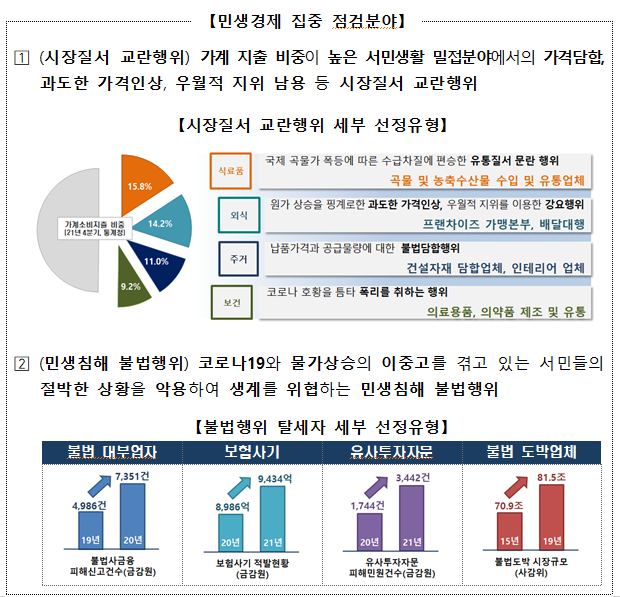코로나19 장기화와 생활물가 상승 및 최근 우크라이나 사태 등으로 생활물가까지 급등하면서 서민들의 경제적 어려움이 가중되고 있는 가운데 시장지배력을 이용한 가격담합, 과도한 가격인상 등 시장질서 교란행위로 폭리를 취하는 민생침해 탈세행위에 증가에 대해 일회성 조사에 그치지 않고 유관기관과 긴밀하게 협력하여 지속적으로 대응해 나가겠다고 전했다.
