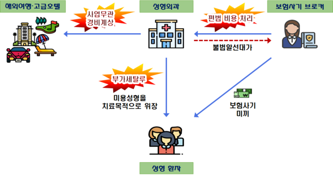 이 중 B 성형외과는 브로커 조직과 결탁하여 실손보험 가입자들을 모집해 수백만 원 상당 미용수술을 하고 보험금을 청구할 수 있도록 치료목적 수술로 변칙 처리하였고, 이를 통해 약 200억원에 달하는 과세매출을 면세매출로 신고하여 부가가치세를 탈루했다.