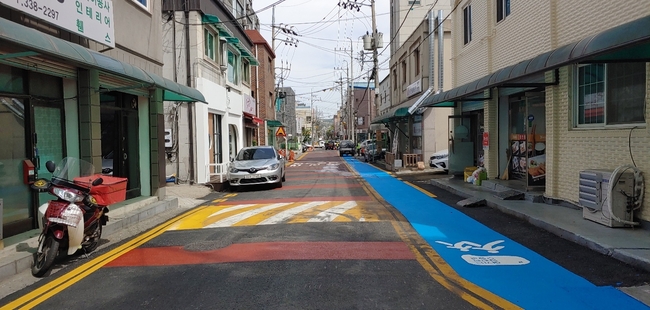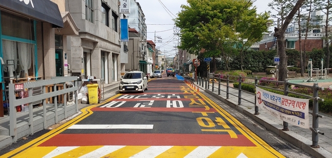 차도와 보도는 분리하고 따로 보도가 설치돼 있지 않은 100m 구간에는 스탠실 공법을 적용해 시인성을 높였으며, 특히 스탠실 공법에 사용하는 도료는 미끄럼 방지 효과도 높아 어린이 안전사고 예방에도 큰 도움이 될 것으로 기대하고 있다.