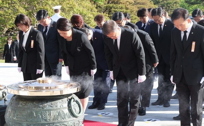 문 대통령 부부는 이날 오전 8시 서울 동작구 국립서울현충원을 찾아 헌화·분향하고 순국선열 및 호국영령의 넋을 기렸다.