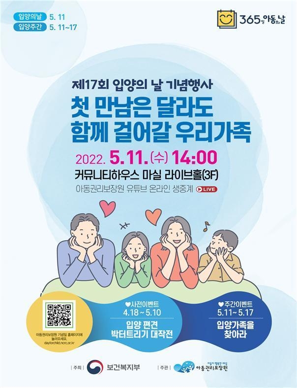 한편 복지부는 11일 오후 2시 커뮤니티하우스 마실 라이브홀에서 '제17회 입양의날' 기념식을 열고 유공자를 포상했다. 이날 기념식에서는 한국입양홍보회와 해외입양인연대가 입양문화 발전에 기여한 유공자로서 대통령 표창을 받았다.