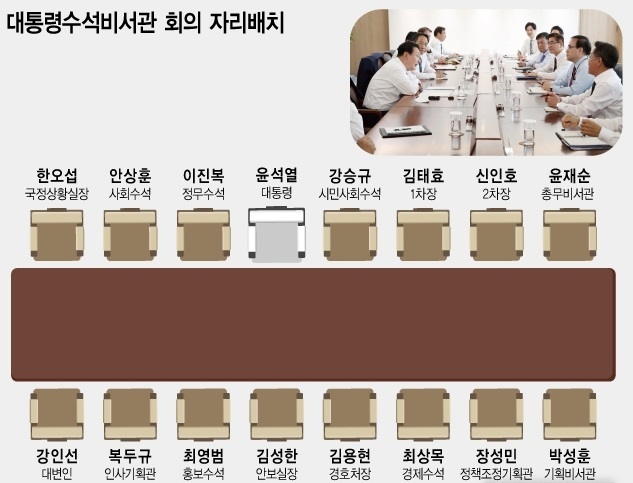 맞은 편은 강인선 대변인, 복두규 인사기획관, 최영범 홍보수석, 김성한 국가안보실장, 김용현 경호처장, 최상목 경제수석, 장성민 정책조정비서관, 박성훈 기획비서관이 순서대로 앉았다.