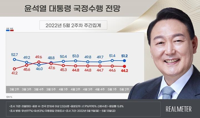 리얼미터의 5월2주차 주간집계 결과, 윤 대통령이 국정수행을 잘할 것이라는 긍정적 전망은 51.2%, 잘하지 못할 것이라는 부정적 전망은 44.2%로 집계됐다. 긍정 전망은 5월1주차 주간집계 때보다 0.2%포인트 줄었다.