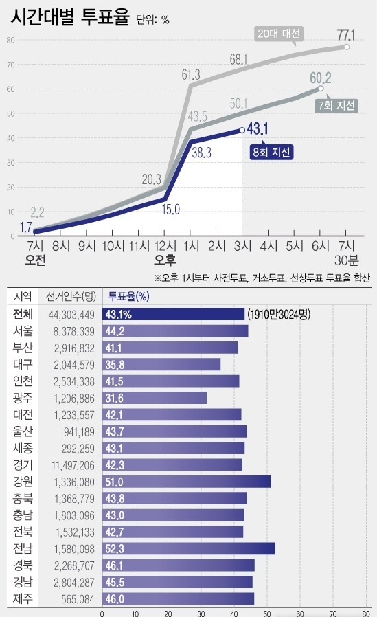 중앙선거관리위원회에 따르면 이날 오후 3시 기준 경기지역 유권자 1149만7206명 중 485만8251명(잠정)이 투표장을 찾았다.