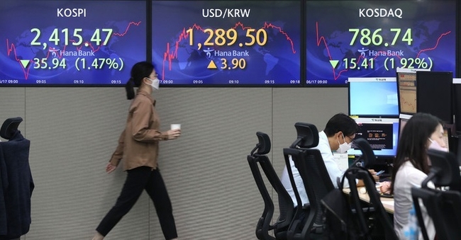 [시사뉴스 홍경의 기자] 20일 코스피는 전 거래일(2440.93)보다 49.90포인트(2.04%) 내린 2391.03에 장을 닫았다. 코스닥지수는 전 거래일(798.69)보다 28.77포인트(3.60%) 하락한 769.92에 거래를 마쳤다. 서울 외환시장에서 원·달러 환율은 전 거래일(1287.3원)보다 5.1원 오른 1292.4원에 마감했다.