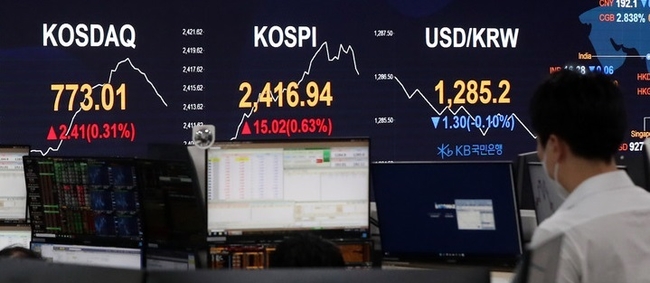 [시사뉴스 홍경의 기자] 28일 코스피는 전 거래일(2366.60)보다 20.18 포인트(0.84%) 오른 2422.10에 장을 닫았다 코스닥지수는 전 거래일(750.30)보다 1.09포인트(0.14%) 하락한 769.51에 거래를 마쳤다. 서울 외환시장에서 원·달러 환율은 전 거래일(1298.2원)보다 3.1원 하락한 1283.4원에 마감했다.
