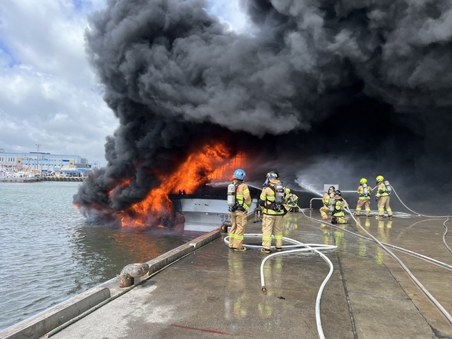 소방당국은 출동과 동시에 주변 선박을 안전 거리 밖으로 이동 조치한 상태다. 해경 소속 배를 이용해 양방향에서 진화하고 있다.