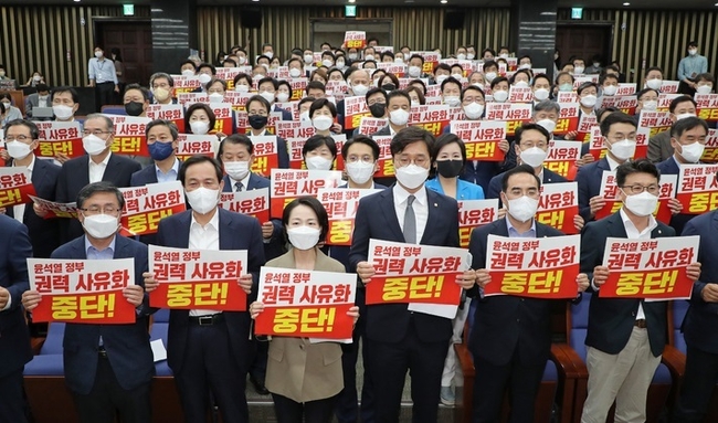 민주당은 '민생 외면·권력 사유화 윤석열 정권 규탄 성명서'를 통해 "윤석열 정권은 검·경 장악 검찰 독재, 정치 보복 시도를 중단하라"며 "시급한 민생 문제 해결을 위해, 국회 정상화에 적극 협조하라"고 촉구했다.