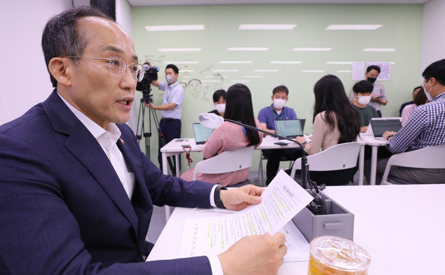 추 부총리는 25일 정부세종청사에서 기자 간담회를 갖고 "28일 아침 이창용 총재, 금융당국 책임자와 만나 미국의 금리 인상 관련 시장상황을 점검하고 얘기를 나눌 예정"이라고 밝혔다.
