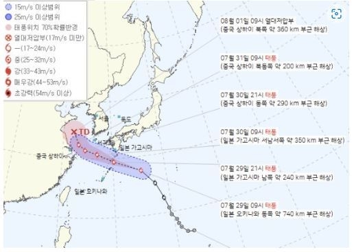 예상 누적 강수량은 최대 300㎜다. 파도가 높게 치고 바람이 강하게 부는 곳도 있겠다. 태풍 영향권 외에도 전국 곳곳에서 소나기가 최대 40㎜ 예보됐다.