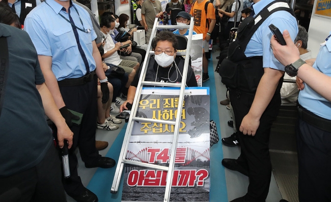 전장연의 지하철 탑승 시위는 지난달 4일 이후 28일 만이다. 당시 전장연은 추 장관의 장애인 권리 예산 반영 확답을 요구하며 "답이 없다면 8월 1일부터 매주 월요일 출근길 지하철을 타겠다"고 예고했다.