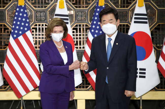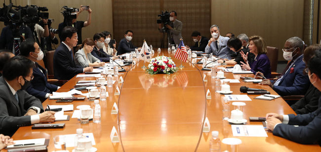 펠로시 의장도 "우리 의회 대표단 순방의 세가지 중요한 목적은 안보, 경제, 거버넌스인데, 이 세가지 분야 모두 미국과 한국이 굉장히 탄탄한 관계를 구축하고 있다"며 "(한미 양국은) 서로를 통해 많이 배우고 있다. 시급한 상황에서 안보 상 위기로 시작된 이 관계가 정말로 따뜻한 우호관계로 발전했다"고 호응했다.