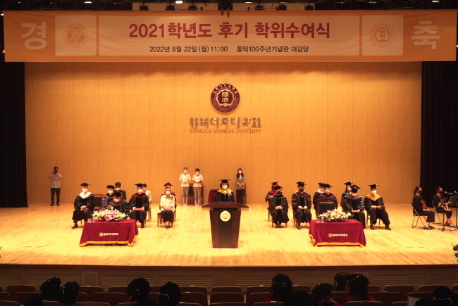 [시사뉴스 홍경의 기자] 동덕여자대학교(총장 김명애) 2021학년도 후기 학위수여식이 지난 22일 본교에서 열렸다. 이 날 박사학위 수여자 10명을 비롯해 △석사 34명 △학사 381명 △평생교육원 학점은행제 학사학위취득자 26명 등 총 451명에게 학위가 수여됐다. 이번 수여식은 동덕 100주년 기념관 대강당에서 오전 11시부터 약 1시간 동안 △학사보고 △학위증서 수여 △축사 △관현악과 축하연주 △교가제창 등으로 진행되었다. 이번 학위수여식은 동덕여대 공식 유튜브 채널과 인스타그램을 통해 생중계 되었다.