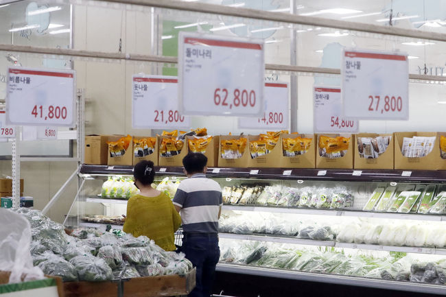 배추가 78.0% 올랐으며 호박도 83.2% 상승했다. 오이(69.2%), 파(48.9%), 포도(22.0%) 등 가격 상승세도 두드러졌다. 예년보다 기온이 높은 데다가 폭우까지 겹치면서 채소류 작황이 부진했던 영향이다. 농산물 가격은 전체 물가의 0.47%포인트(p) 기여했다.