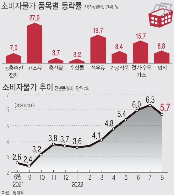소비자물가는 지난해 10월(3.2%), 11월(3.8%), 12월(3.7%), 올해 1월(3.6%), 2월(3.7%)까지 5개월 연속 3%를 보이다가 3월(4.1%)과 4월(4.8%) 4%대에 이어 5월(5.4%) 5%대로 올라섰다. 6월(6.0%)과 7월(6.3%)에는 6%대까지 치솟더니 지난달 3개월 만에 5%대로 상승세가 한풀 꺾였다.