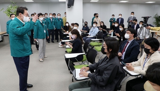 앞서 윤 대통령은 태풍 힌남노 대응을 위해 대통령실 청사에서 밤을 샌 후 이날 오전 두차례 회의를 갖고 기자실을 찾았다.