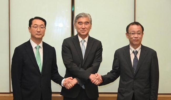 3국 협의에 앞서 김 본부장은 이날 오전 성김 대표, 후나코시 국장과 각각 한미·한일 양자협의도 진행했다.