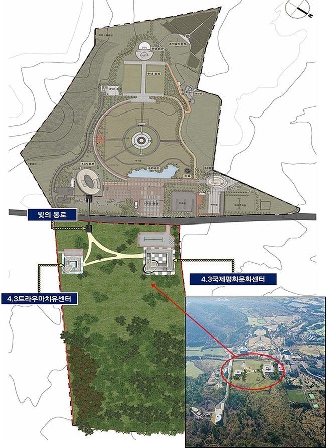 13일 제주특별자치도에 따르면 4·3평화공원 활성화 사업은 공원 내 하부대지(17만6000㎡)에 국비 258억원을 들여 ▲4·3국제평화문화센터 ▲4·3트라우마치유센터 ▲빛의 통로 등을 건립하는 것으로, 오는 2025년 준공이 목표다.