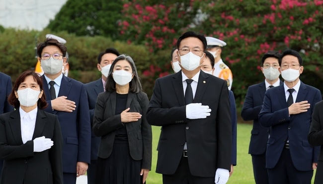 정 위원장은 참배 후 기자들과 만나 “막중한 책임감을 갖고 우리가 출발해야 될 것 같다. 국민의 선택을 받은 우리 윤석열 정부가 정말 순항할 수 있도록, 제대로 힘차게 발진할 수 있도록 당정이 일체감을 갖고 우리가 힘을 모아야 되겠다, 그런 얘기를 나눴다”고 말했다.