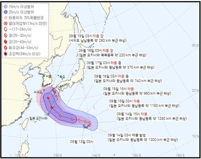 태풍은 이날 오후 3시 기준 오키나와 동남동쪽 약 1280㎞ 해상에서, 16일 오전 3시에는 오키나와 동남동쪽 약 960㎞ 해상까지 사람이 걷거나 약간 뛰는 정도인 시속 6~18㎞의 속도로 천천히 서북서진할 것으로 예상된다. 또 19일 오전 3시에는 서귀포 남남동쪽 약 280㎞ 해상까지 북상할 것으로 보이며, 중심기압은 970hPa, 강풍반경은 350㎞, 최대풍속 초속 35m, 태풍 강도는 기차가 탈선하는 정도인 '강'으로 예상된다.