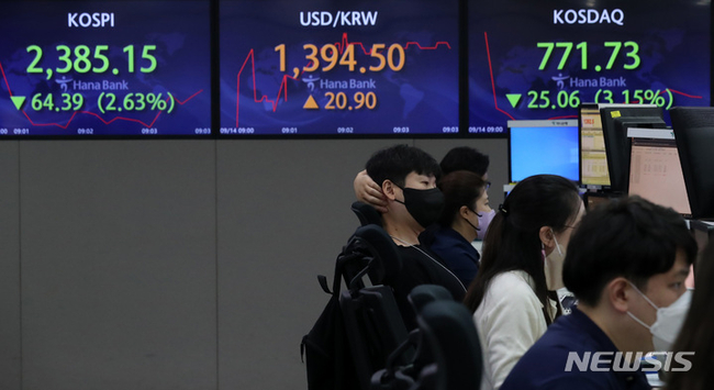 [시사뉴스 김미현 기자] 코스피가 하루 만에 장중 2400선 아래로 내려가면서 2380선으로 후퇴해 2.5% 급락 출발했다. 코스닥은 3% 하락했다.