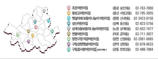 이에 따라 '365열린어린이집' 9개소는 ▲용산구 동빙고어린이집 ▲강동구 구립 꿈사랑어린이집(10월부터 이용가능) ▲종로구 조은어린이집 ▲중랑구 햇살아래보듬이나눔이 어린이집 ▲성북구 성신어린이집 ▲노원구 상계5동보듬이나눔이 어린이집 ▲마포구 연봉어린이집 ▲양천구 양천구청 직장어린이집 ▲관악구 구립성현햇살어린이집 등이다.