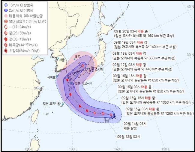 제14호 태풍 '난마돌'(NANMADOL)은 오키나와로 향하며 세력을 키운 뒤 오는 19일 오전 3시에는 일본 가고시마 북서쪽 약 140㎞ 해상까지 북상할 것으로 관측된다. 이때 중심기압은 965hPa, 강풍반경은 330㎞, 최대풍속 초속 37m, 태풍 강도는 기차가 탈선하는 정도인 '강'으로 전망된다.