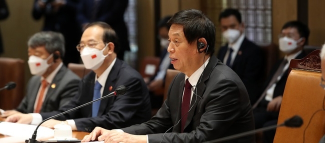 리 위원장은 이날 오후 김진표 국회의장과 면담 직후 한중 공동 언론 발표에서 이같이 밝힌 뒤 "중한 양측은 의사소통을 강화하고 한반도 문제의 정치적 해결 프로세스를 추진하기 위해 적극적인 역할 발휘해야 한다"고 말했다.