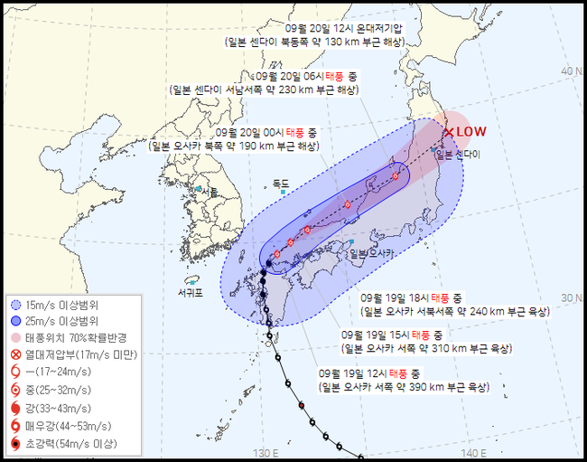 '난마돌'은 이날 오후 3시 일본 오사카 서북서쪽 310㎞ 해상으로 이동해 20일 오전 3시 오사카 북북동쪽 240㎞ 해상, 오전 9시 센다이 서남서쪽 140㎞ 육상을 지난 뒤 오후 3시 센다이 북동쪽 160㎞ 해상에서 온대저기압으로 약화할 것으로 보인다.