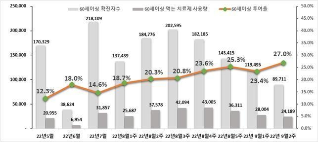 60세 이상 고령층 확진자 대상 팍스로비드, 라게브리오 등 먹는 치료제 처방률은 평균 27.0%로 전주대비 3.6%포인트 증가했다.