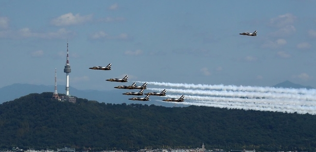 [시사뉴스 홍경의 기자] 공군이 21일 오후 여의도 상공에서 국군의 날 축하비행 훈련을 실시했다. 훈련 비행은 낮 12시20분부터 20분간 여의도 한강공원 주변에서 이뤄졌다. 공군은 "항공기 기동 등으로 인한 소음 발생이 예상되오니 이해와 협조 부탁드린다"고 시민들의 양해를 구했다. 국군의 날 기념 블랙이글스 축하비행은 다음달 3일 오전 11시40분과 오후 4시40분에 각각 10분간 진행된다.