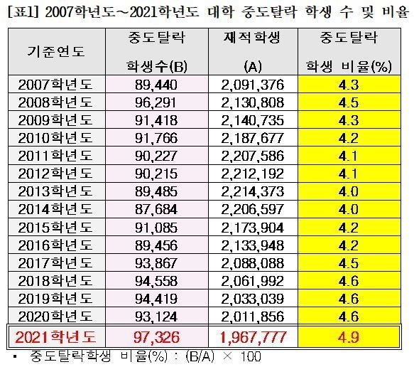 21일 종로학원에 따르면 지난 8월 대학알리미 사이트에 공시 자료인 4년제 대학의 2021학년도 대학 중도탈락 학생 수는 9만 7천 326명이고, 재적 학생 대비 중도탈락 학생 비율은 4.9%로 2008년 대학알리미 첫 공시 이후 중도탈락 학생 수 및 비율 모두 역대 최고인 것으로 나타났다.