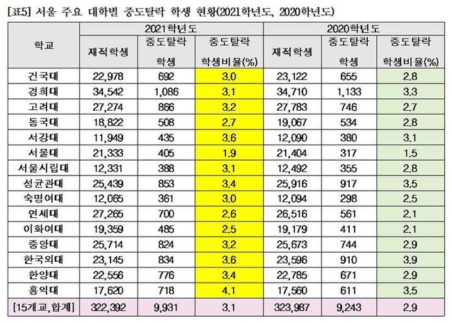서울 주요 대학별로는 홍익대가 4.1%(이전 연도 대비 0.6%p↑)로 가장 높았고, 서강대 3.6%(이전 연도 대비 0.5%p↑) 순이고, 한국외대 3.6%(0.3%p↓), 성균관대 3.4%(0.1%p↓), 경희대 3.1%(0.2%p↓), 동국대 2.7%(0.1%p↓)를 제외하면 대부분의 대학들의 중도탈락비율이 이전연도 대비 상승하여 15개교 2021학년도 중도탈락 평균 비율은 3.1%로 이전연도 대비 0.2%p 증가하였다.