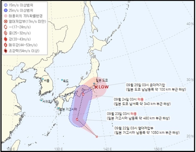 태풍은 72시간 뒤인 25일 오전 3시께 도쿄 남남동쪽 약 100㎞ 부근 해상에서 온대저기압으로 소멸할 것으로 예측된다고 기상청은 전했다.