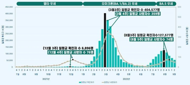 여름철 유행 정점 주간인 8월 3주차 일평균 확진자는 12만7577명으로 3월 오미크론 유행 당시 40만명의 3분의 1 규모였다.