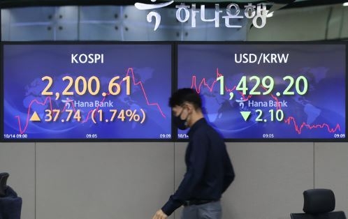 14일 코스피는 전 거래일(2162.87)보다 49.68포인트(2.30%) 상승한 2212.55에 장을 닫았다. 이날 1.75% 상승한 2200.66에 출발한 지수는 2거래일 만에 2200선을 회복한 뒤 유지했다.