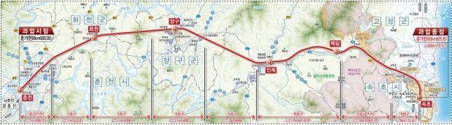 '춘천~속초 동서고속화철도'는 서울에서 춘천을 거쳐 속초까지 뻗어나가는 국가철도망의 핵심 노선으로, 앞으로 6년간 93.7km의 철도를 신설, 사업비는 약 2조4000억원이 투입된다.