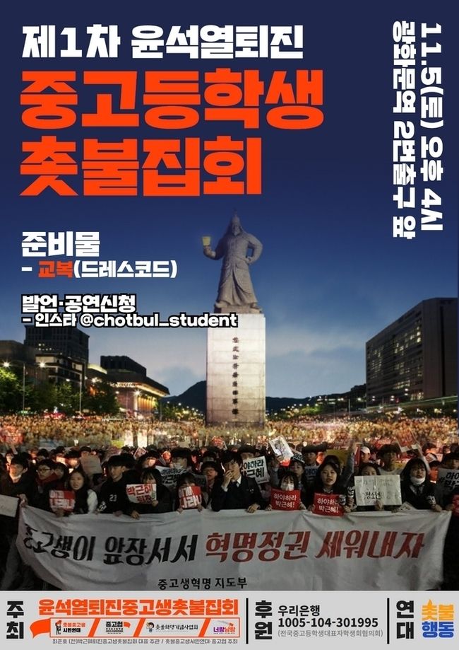 이 집회는 내달 5일 광화문 일대 개최 예정인 '제1차 윤석열퇴진 중고등학생 촛불집회'로, 촛불중고생시민연대(시민연대)가 주최한다. 그런데 온라인상을 중심으로 해당 촛불집회에 참가하는 학생들은 봉사활동 시간을 인정받을 수 있다는 내용이 적힌 포스터가 확산됐다.