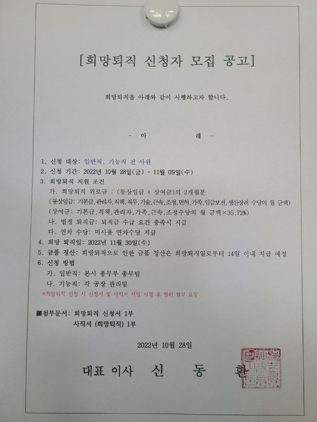 신 대표는 회사 게시판에 공고문을 게시하고 다음달 9일까지 일반직, 기능직 전 사원을 대상으로 희망퇴직 신청을 받는다고 밝혔다. 조건은 위로금과 법정 퇴직금, 미사용 연차 수당 지급 등이다. 위로금은 통상임금과 상여금을 합쳐 2개월분이다.