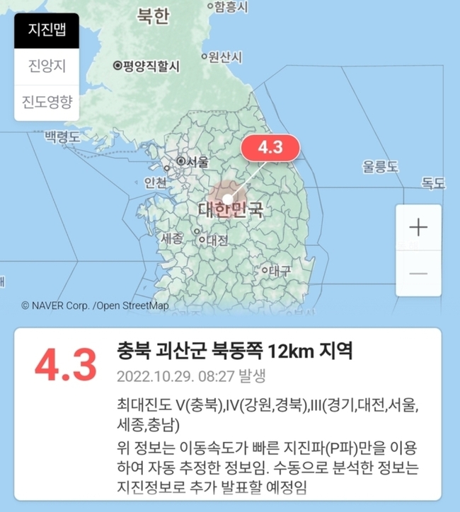 [시사뉴스 김미현 기자] 기상청이 29일 오전 8시 27분 49초, 충북 괴산군 북동쪽 12㎞ 지역에서 규모 4.1 지진이 발생했다고 밝혔다.