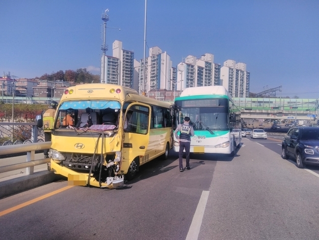 [시사뉴스 김미현 기자] 31일 오전 11시55분경 경기 남양주시 퇴계원읍 퇴계원교 인근 교차로에서 어린이집 버스와 시내버스가 추돌하는 사고가 발생했다. 이 사고로 어린이집 통학버스에 타고 있던 교사와 원아 3명이 타박상 등 경상을 입었다.