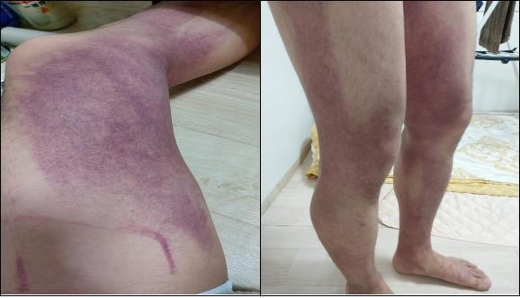 성인 남성으로 보이는 A씨의 다리가 허벅지부터 발목까지 피멍이 심하게 든 모습이었다. 당시 압박감이 매우 심했던 걸로 보인다.