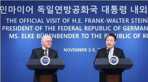 이에 윤 대통령은 "슈타인마이어 대통령께서 이 자리를 빌려 이태원 참사로 인한 희생자와 유가족에 다시 한번 애도를 표하고 독일 국민의 따뜻한 위로를 전해주신 데 대해 깊이 감사드린다"고 화답했다.
